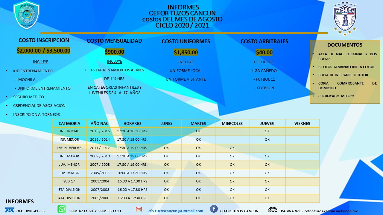 Somos un Centro de formación de jugadores con sede en la ciudad de Cancún. Contamos con una filial del Club de Fútbol Profesional Tuzos de la ciudad de Pachuca, Hidalgo. De igual forma, tenemos el respaldo del Grupo Pachuca; el Grupo Pachuca es un grupo empresarial ubicado en la ciudad de Pachuca en el estado de Hidalgo, este grupo empresarial es dueño/inversionista de los equipos de fútbol profesionales Pachuca, Mineros de Zacatecas, León, Coyotes de Tlaxcala, Everton de Viña del Mar (Como Inversores) . Asi como de varios niveles de negocio y la Universidad del Fútbol y Ciencias del Deporte. Su presidente es Jesús Martínez Patiño.